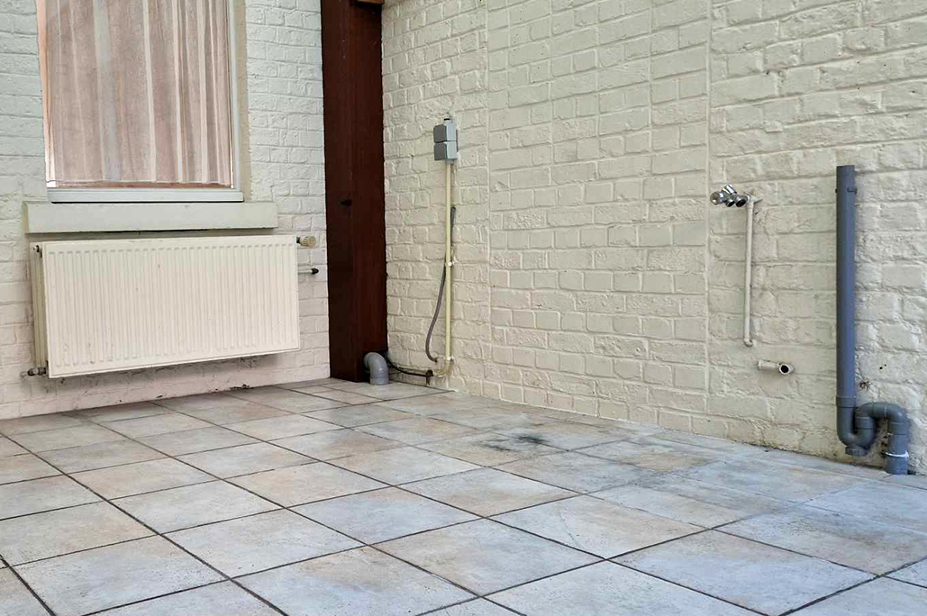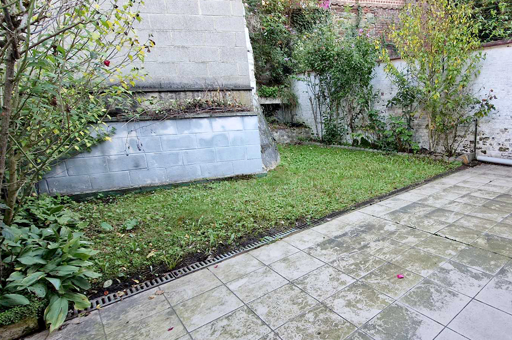 Terrasse carrelée, petit jardin clôturé